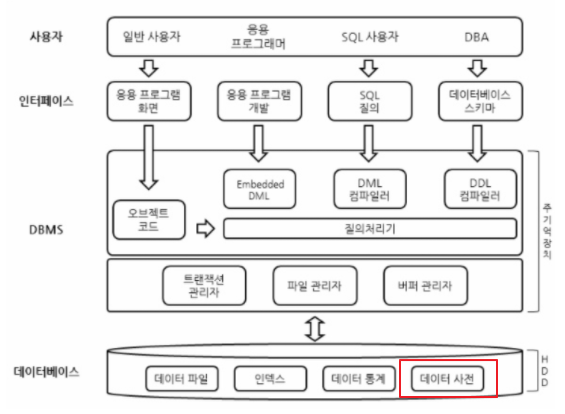 Data Directory : 데이터 사전에 수록된 데이터를 실제로 접근하는데 필요한 정보를 관리 유지하는 시스템. 시스템 카탈로그는 사용자와 시스템 모두 접근 가능. 데이터 디렉터리는 시스템만 접근 가능
