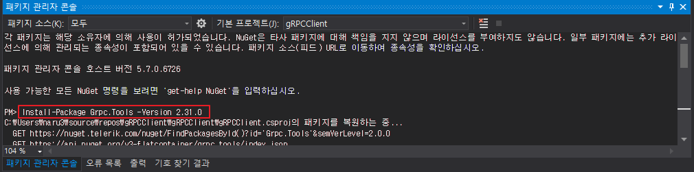 gRPCClient에 'Grpc.Tools 2.31.0'을(를) 설치했습니다.