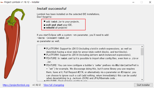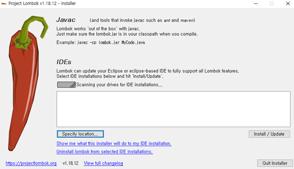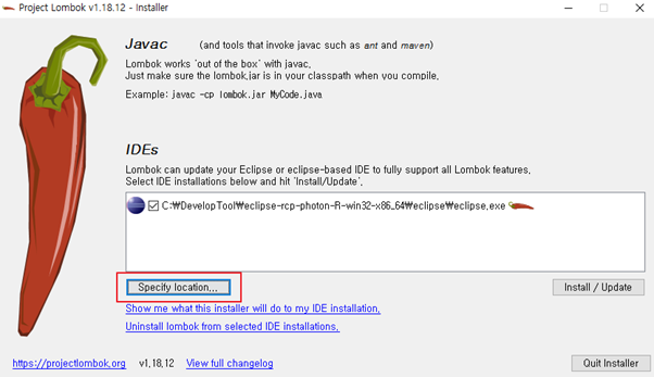 Lombok 사이트 – Download에서 jar파일을 다운받고 jar파일을 실행하면 됩니다.