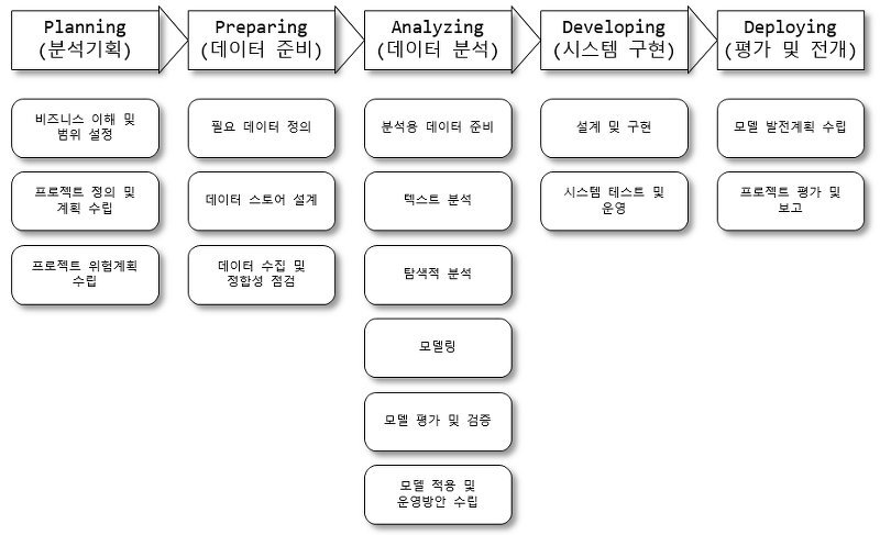 | 프로젝트 정의 및 계획 수립 | 모델의 운영 이미지를 설계하고 모델 평가 기준을 설정, 프로젝트의 정의를 명확하게 함 WBS를 만들고 데이터 확보계획, 빅데이터 분석 방법, 일정 계획, 예산 계획 등 프로젝트 수행 계획을 작성 |