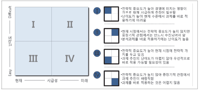 | 시급성 | 목표 가치와 전략적 중요도에 부합하는지에 따른 시급성이 가장 중요한 기준임 시급성의 판단 기준은 전략적 중요도가 핵심사항임 분석 과제의 목표 가치(KPI)와 전략적 중요도를 현재의 관점에서 둘 것인지, 미래의 관점에서 둘 것인지를 함께 고려하여 시급성 여부 판단 필요 |