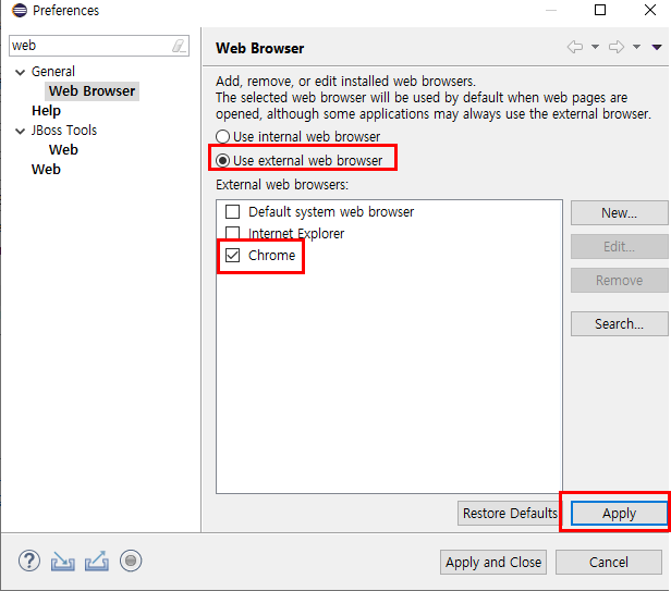 이클립스를 설치한지 얼마 되지 않았을때, 웹 프로젝트를 생성하고 실행시켜보면 이클립스 내부에서만 웹 사이트에 연결이 되어 곤란한 경우가 있다. 웹 프로젝트를 실행시킬 때 주로 사용하는 웹 브라우저와 연동하는 방법이 있는데 아주 간단하다.