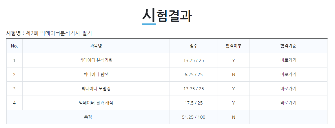 4월 17일 날 보았던 빅데이터분석기사 필기 시험 결과입니다.
