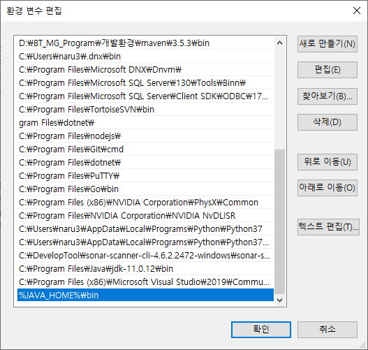 Path의 환경변수에 %JAVA_HOME%\bin을 입력하고 저장합니다.