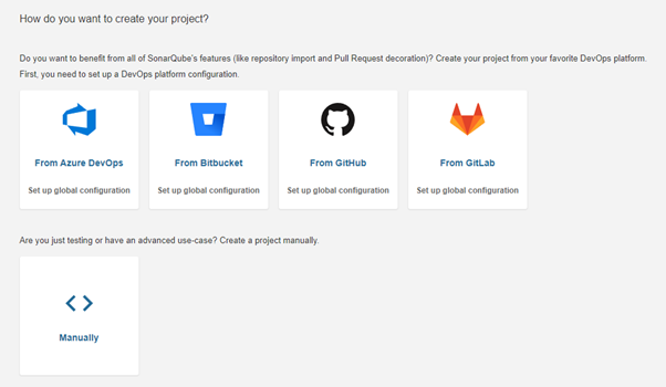 소나 큐브에서 프로젝트를 생성하는데, 이때 Local 환경에서 테스트를 할 것이기 때문에 Manually를 선택해서 프로젝트를 생성합니다.