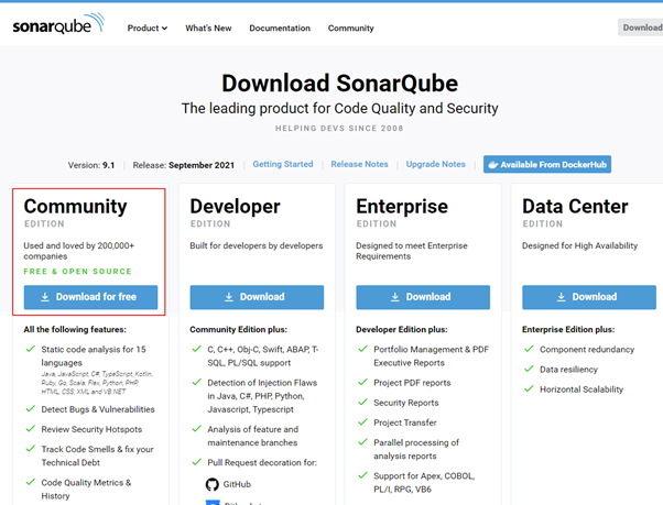Get the latest LTS and version of SonarQube the leading product for Code Quality and Security from the official download page.