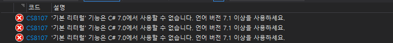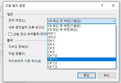 여기서 빌드 언어 버전을 C# 7.1이상으로 잡아주면 에러 없이 빌드가 정상적으로 동작합니다.