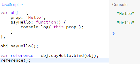 위의 코드에서 sayHello 메서드 안의 this는 obj의 객체가 되어 obj.prop인 Hello를 전달받아 콘솔 로그를 찍게 됩니다.