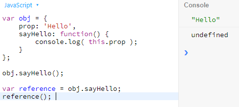 위의 예제에서 obj.sayHello()를 호출할 때는 정상적으로 출력이 되지만 reference에 담고 나서 출력을 해보면 undefiend가 출력됩니다.