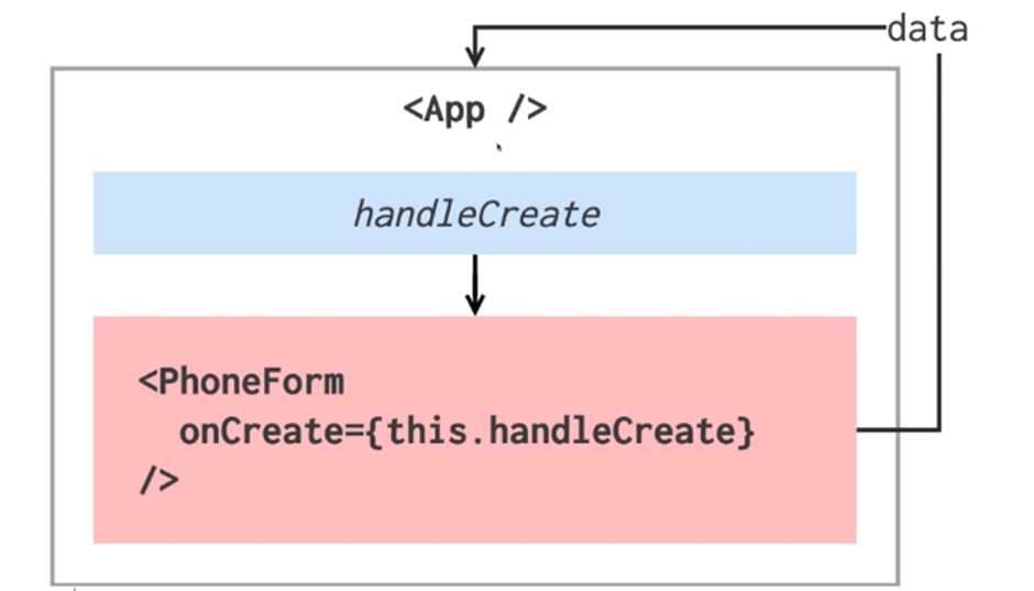 먼저 App 컴포넌트 내부에서 handleCreate라는 메소드를 만듭니다. 만든 메소드를 자식 컴포넌트인 PhoneForm에게 onCreate에 props로 전달해줍니다.