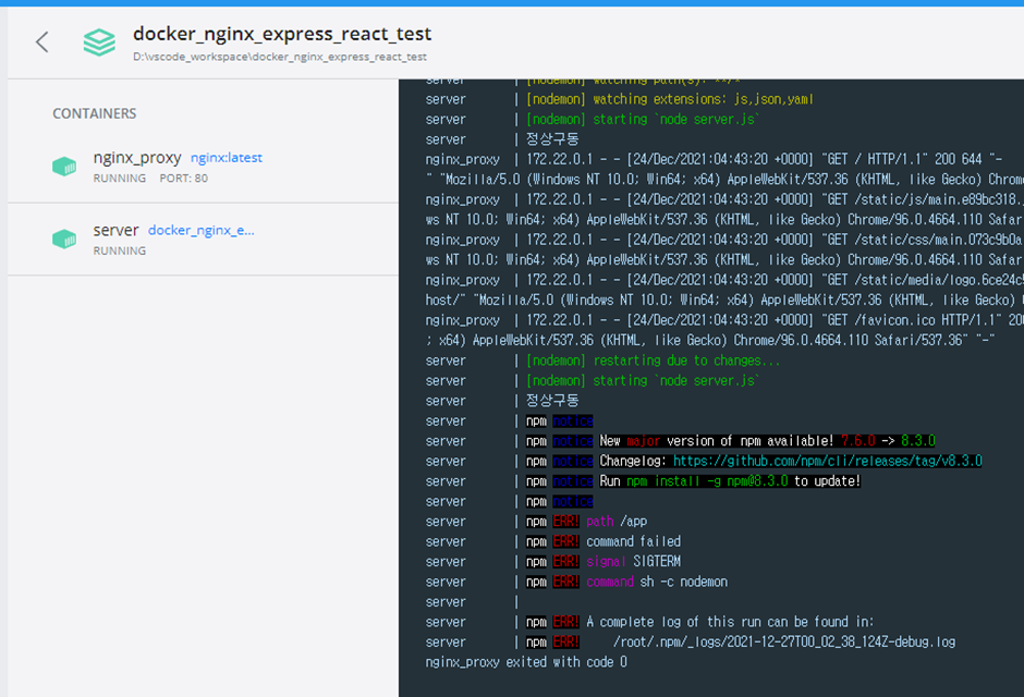 그러고 나서 도커를 확인해보면 아래와 같이 proxy와 express 서버가 가동이되고
