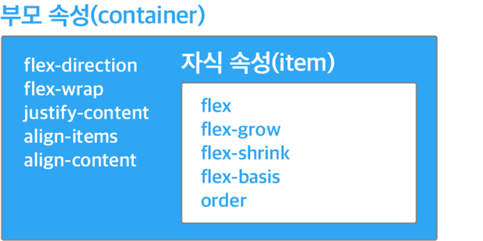 이런 flexbox의 전체적인 정렬과 흐름 속성은 부모인 flex container에서 정의하고, 크기나 순서에 관련된 속성은 자식 요소에 해당하는 flex-item에서 정의합니다.