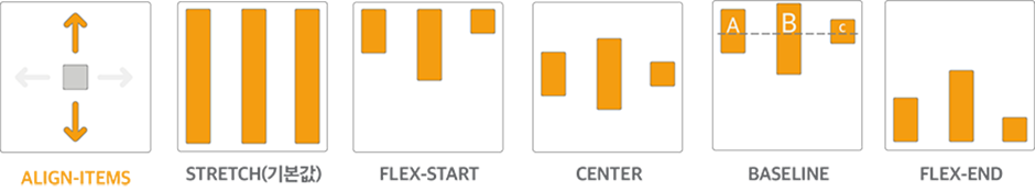 - baseline: 글꼴의 기준선인 baseline을 기준으로 flex item을 정렬합니다.
