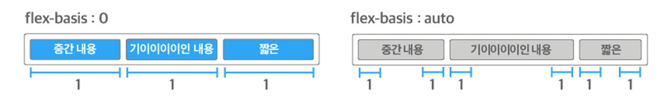 이때, flex-basis 속성의 값을 auto로 설정하면 flex item은 상대적 flex item(relative flex item)이 되어 콘텐츠의 크기를 기준으로 크기가 결정됩니다.