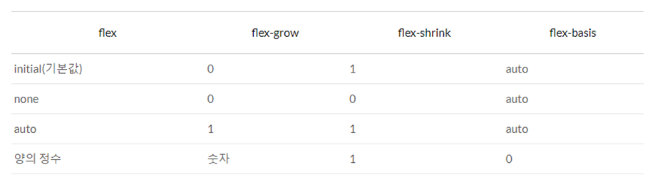 - 숫자값: flex container를 일정한 비율로 나눠 가지면서 flex container의 크기에 따라 flex item의 크기가 커지거나 작아집니다.