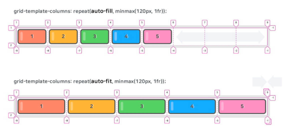 auto-fill과 auto-fit은 크기가 충분하지 않을 경우 자동으로 처리한다는 점에서는 같지만, 아래와 같이 auto-fill은 남는 공간(빈 트랙)을 그대로 유지하고, auto-fit은 남는 공간을 축소한다는 특징이 있습니다.