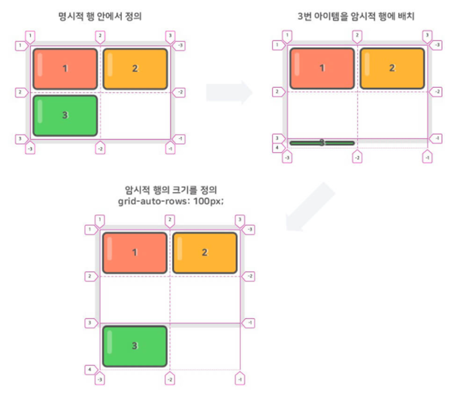 이때 명시적(template)로 지정하지 않은 rows의 크기를 암시적(auto)로 지정해서 처리할 수가 있습니다.