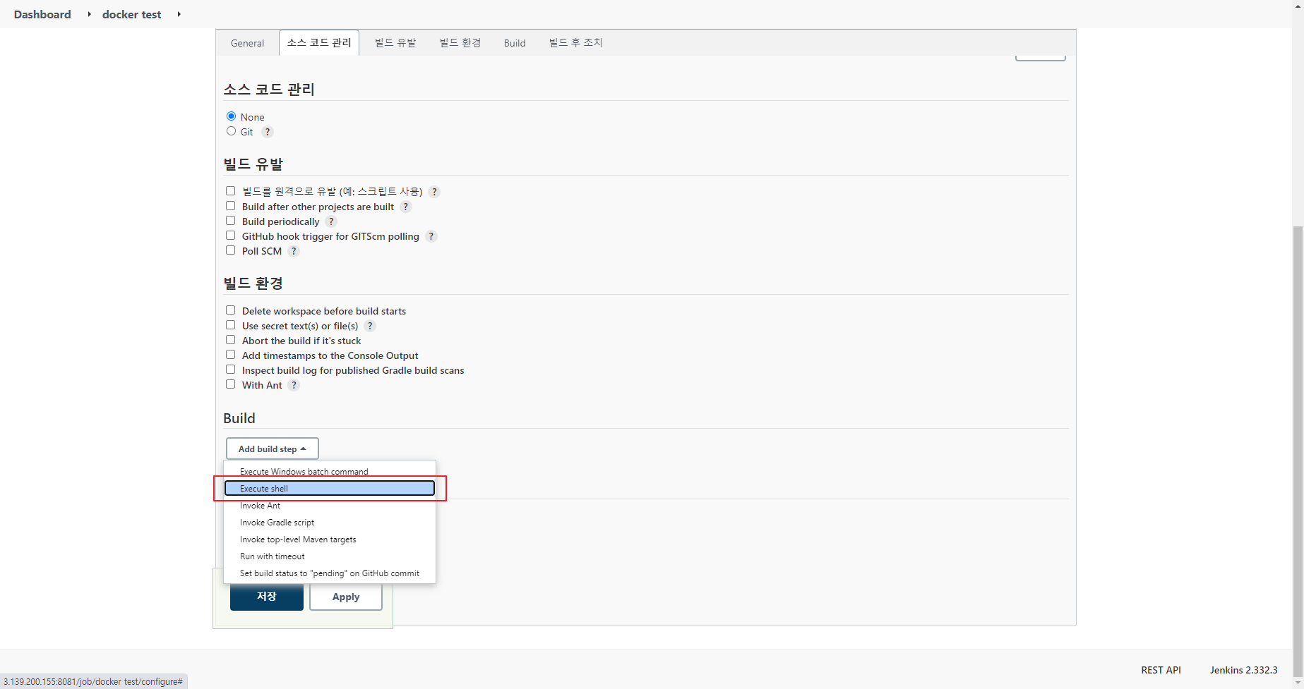 Build - Execute Shell 을 선택