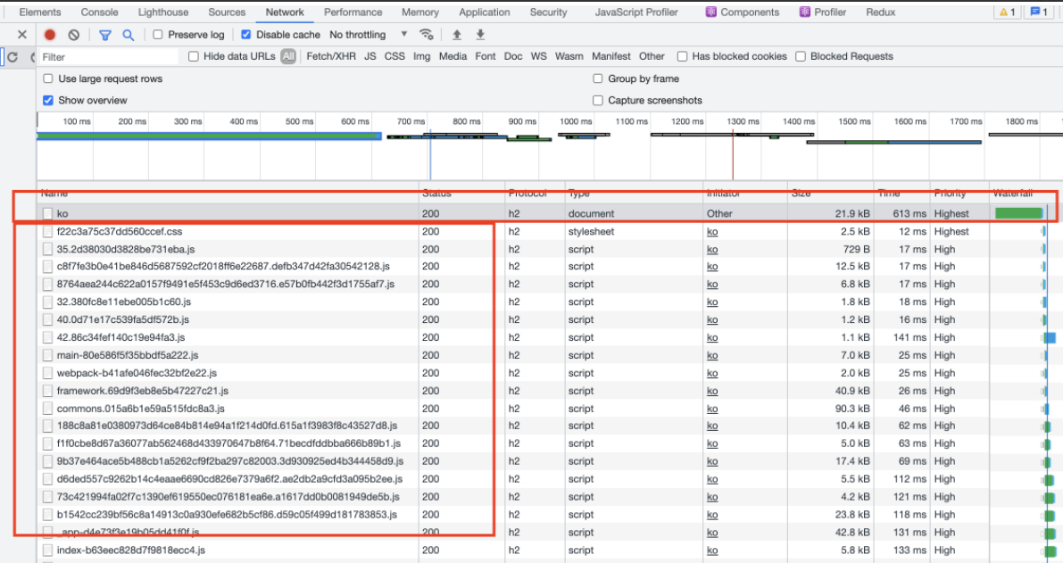 실제로 Next.js로 제작된 웹페이지를 방문하게 되면 맨 처음 document 타입의 파일을 전송받고, 그 이후에 렌더링된 React.js 파일들이 Chunk 단위로 다운로드 되는 것을 확인할 수 있습니다.