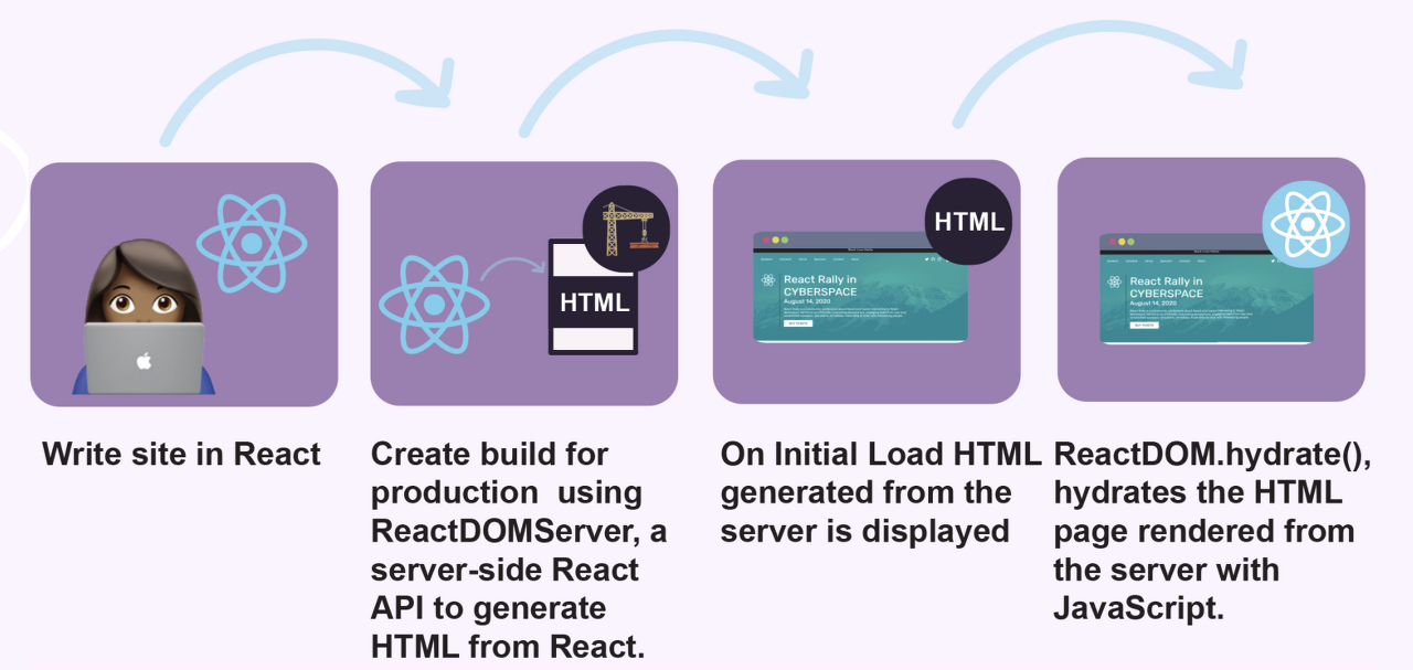 Hydrate란, Server Side단에서 렌더링 된 정적 페이지와 번들링된 js파일(Webpack)을 클라이언트에게 보낸 뒤, 클라이언트 단에서 HTML 코드와 React인 js 코드를 서로 매칭시키는 과정을 말합니다.
