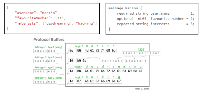 위 그림은 json과 Protocol buffer를 사용한 직렬화의 차이를 나타낸 것인데