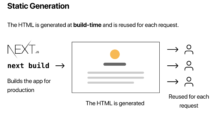 SSG는 빌드를 진행할 때 pages 폴더에서 작성한 각 페이지들에 대해 각각의 문서를 생성해서 static한 파일로 생성합니다.