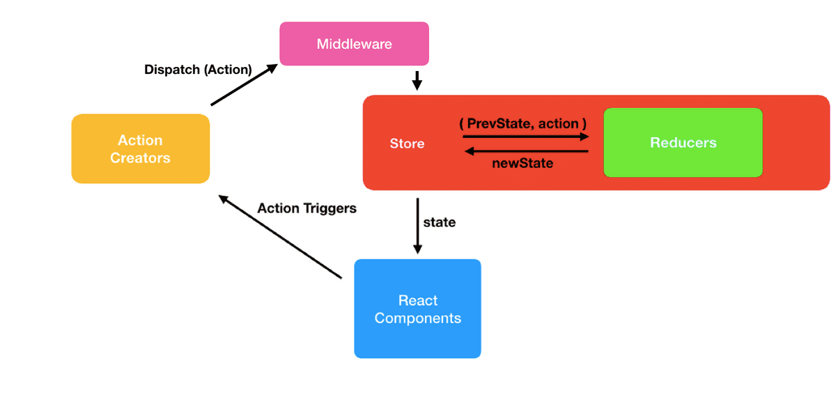 위와 같이 디스패치 함수 안에 액션 생성함수를 지정하고, onIncrease()(액션 생성함수)를 호출하면, 액션 생성함수로 인해 액션이 생성되고, 그 다음 리듀서가 호출되며 현재의 상태(텍스트 박스의 숫자가 3이면 3, 혹은 19면 19)에 리듀서에서 지정한 return state +1이 반환되며, 이 값이 스토어(store)에 저장됩니다.