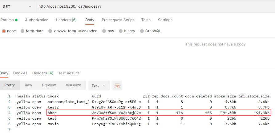 아래와 같이 shop라는 인덱스에 적재가 된 내용을 확인해볼 수 있습니다.