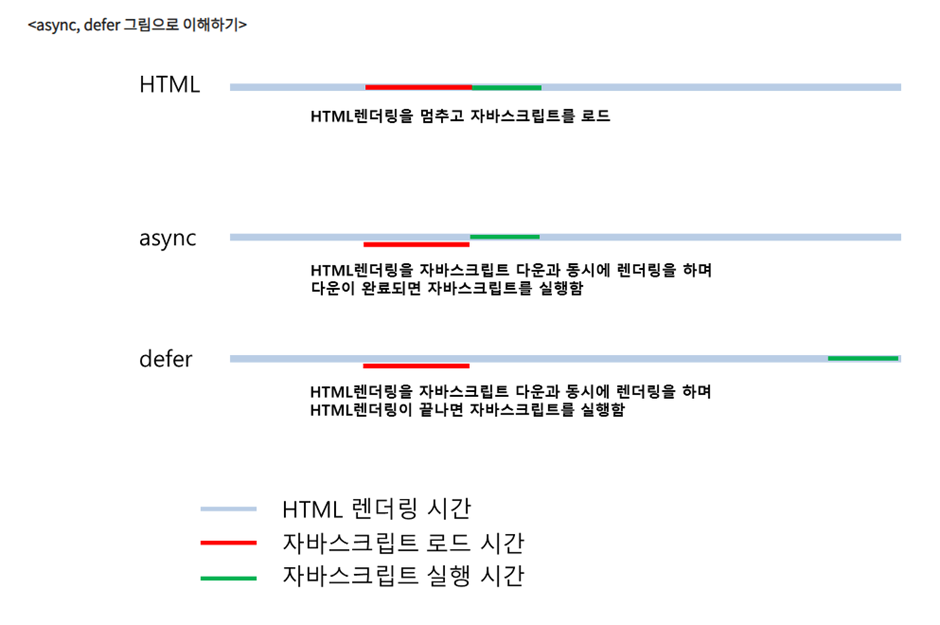 Defer : html 렌더링을 멈추지 않고 동시에 js 파일을 다운로드하고 html 렌더링이 끝난 후에 자바스크립트를 실행합니다.