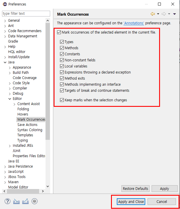 2. Java - Editor - Mark Occurrences로 들어간다.