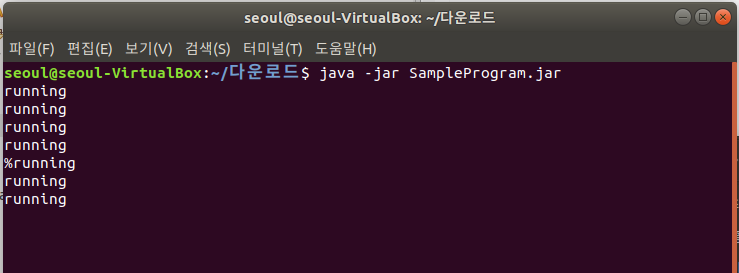 1초마다 running을 출력하는 SampleProgram를 실행시켰습니다.
