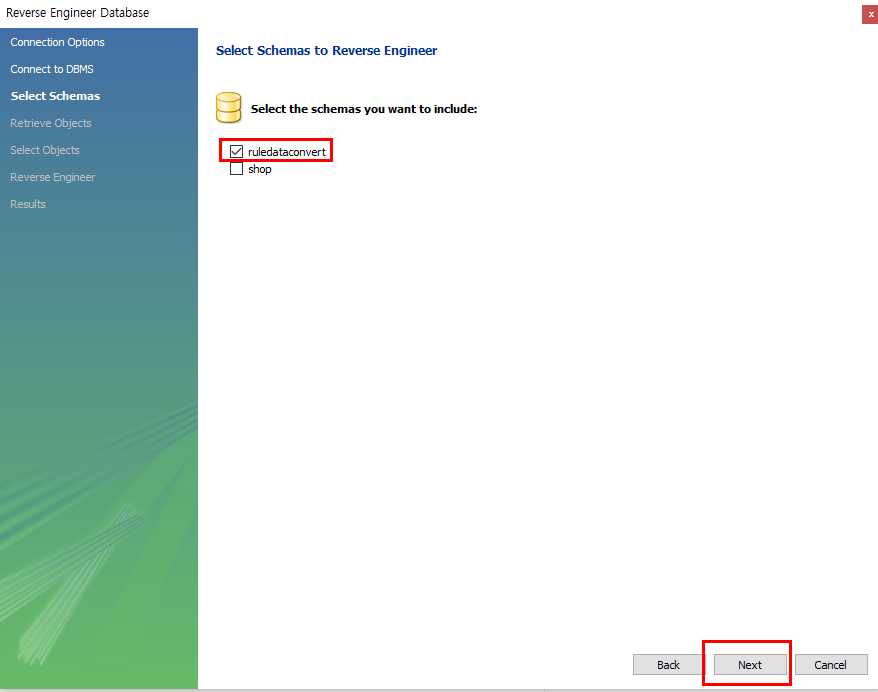 저는 ruledataconvert라고 임의로 생성한 스키마를 선택했습니다.
