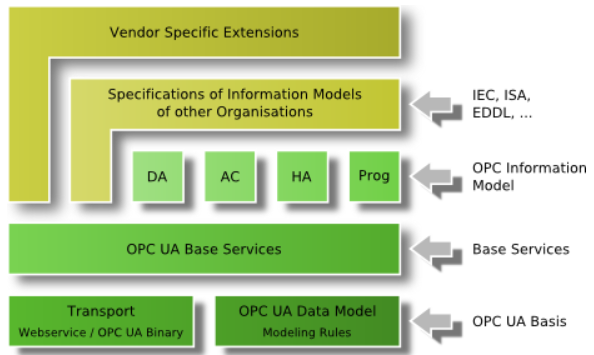 산업 응용 분야의 다양한 요구사항에 따라 데이터 엑세스(DA), 경보 빛 이벤트(AE), 기록 데이터 엑세스(HDA)가 주요 세가지 OPC 사양입니다.