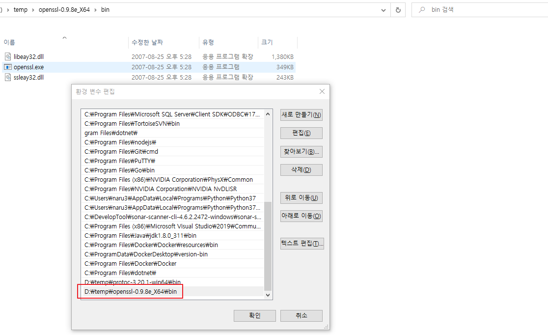 2번에서 압축 파일을 받고 푼 다음, /bin 경로에 있는 openssl.exe를 시스템 환경변수에 등록해줍니다.